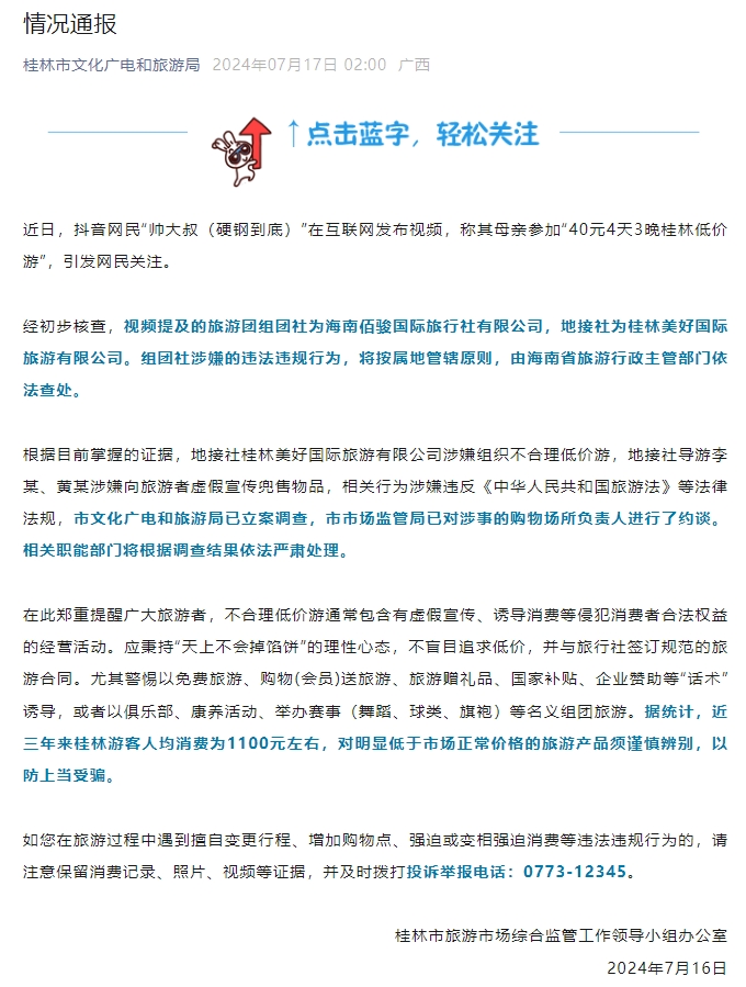 中新網(wǎng)7月17日電 桂林市文化廣電和旅游局官微發(fā)布情況通報,近日,抖音網(wǎng)民“帥大叔(硬鋼到底)”在互聯(lián)網(wǎng)發(fā)布視頻,稱其母親參加“40元4天3晚桂林低價游”,引發(fā)網(wǎng)民關(guān)注。
