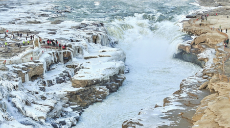 1月11日,人們?cè)诩h黃河壺口瀑布拍照游玩。連日來(lái),受冷空氣影響,吉縣黃河壺口瀑布形成壯美“冰瀑”景觀,吸引大量游客前來(lái)賞景。
