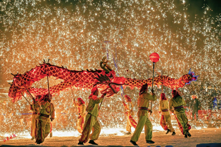 除了誘人的美食,精彩演藝必不可少?!靶麓貉灿巍钡慕k麗花車流光溢彩,演員們身著精致華麗的服飾載歌載舞,與游客熱情互動(dòng)。限定非遺“祈福花火秀”更是帶來(lái)一場(chǎng)視覺(jué)盛宴,“鐵樹(shù)銀花落,萬(wàn)點(diǎn)星辰開(kāi)”,火龍鋼花與落花秀相互交融,鐵火流星漫天飛舞,一起感受跨越千年的祝福與熾熱。還有“鬧新春”主題晚會(huì),歌舞、雜技輪番上演。廣大游客還可在歡聲笑語(yǔ)中圍著篝火牽手狂歡,共度闔家團(tuán)圓的美好時(shí)光。