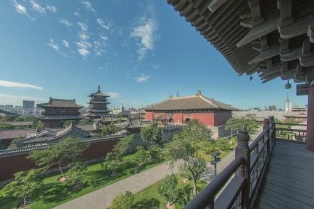 華嚴(yán)寺始建于遼重熙七年(公元1038年),其名取自佛教經(jīng)典《華嚴(yán)經(jīng)》中“慈悲之華,必結(jié)莊嚴(yán)之果”。寺院坐西向東,山門、普光明殿、大雄寶殿、薄伽教藏殿、華嚴(yán)寶塔等30余座單體建筑分別排列在南北兩條主軸線上,布局嚴(yán)謹(jǐn),規(guī)模宏大,占地面積達(dá)6.6萬平方米,是我國現(xiàn)存年代較早、保存較完整的一座遼金寺廟建筑群,1961年被國務(wù)院公布為第一批全國重點(diǎn)文物保護(hù)單位,2014年被評(píng)為國家4A級(jí)旅游景區(qū)。