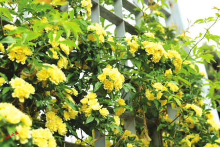 黃木香是薔薇科薔薇屬植物,攀緣小灌木,高度可達(dá)6米。花小型,多朵成傘形花序,花重瓣黃色。黃木香的生長(zhǎng)速度非??欤p輕松松就可以長(zhǎng)成一面花墻,它的枝條柔軟,像一個(gè)個(gè)藤蔓精靈,在園藝師的奇思妙想下,或成為墻壁精美的外衫,或可將一個(gè)普通的架子攀援成蜿蜒