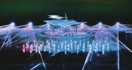 在這場(chǎng)演出中,最令人驚嘆的當(dāng)數(shù)傳統(tǒng)文化與現(xiàn)代科技的完美融合。《如夢(mèng)晉陽》演出設(shè)備島造型由大量不銹鋼鋼管經(jīng)過設(shè)計(jì)、再加工拼接而成,整體形成“山”的造型,好似坐落于湖中心的小島。面積高達(dá)182米×82米的全水下噴泉矩陣、2000多束璀璨燈光,配合前方的直流、對(duì)拱、扇形水幕,連同后方80米×19米網(wǎng)幕形成的視覺矩陣投影,展現(xiàn)出宏大的山景古城畫面。這些畫面栩栩如生,將晉陽古城的歷史變遷、文化傳承一一展現(xiàn)在觀眾眼前,讓人仿佛置身于歷史的長(zhǎng)河之中,親身感受著晉陽的興衰榮辱。