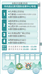 太原市將在山西文博會(huì)期間開(kāi)通5條免費(fèi)公交接駁專線。其中,4條市內(nèi)直達(dá)瀟河國(guó)際會(huì)展中心的專線,分別從九豐路公交總站—萬(wàn)象城(北向南新晉祠路長(zhǎng)興北街口公交站)—瀟河國(guó)際會(huì)展中心;勝利橋東公交總站—敦化坊(北向南建設(shè)北路敦化坊公交站)—山西大學(xué)(北向南塢城路山西大學(xué)公交站)—瀟河國(guó)際會(huì)展中心;火車(chē)南站西廣場(chǎng)公交站—瀟河國(guó)際會(huì)展中心;西橋地鐵站B站口—瀟河國(guó)際會(huì)展中心。運(yùn)行時(shí)間為市內(nèi)至瀟河方向8:00—15:00,瀟河至市內(nèi)方向10:00—18:00。此外,為便于駕車(chē)自行前往的市民出行,還開(kāi)通了1條社會(huì)停車(chē)場(chǎng)至山西瀟河國(guó)際會(huì)展中心的免費(fèi)接駁線路。該線路從先行路瀟河大街口經(jīng)先行路至?xí)怪行耐颠\(yùn)行,在智慧南街口、先行路樂(lè)商街口??浚\(yùn)行時(shí)間為9:00—18:00。