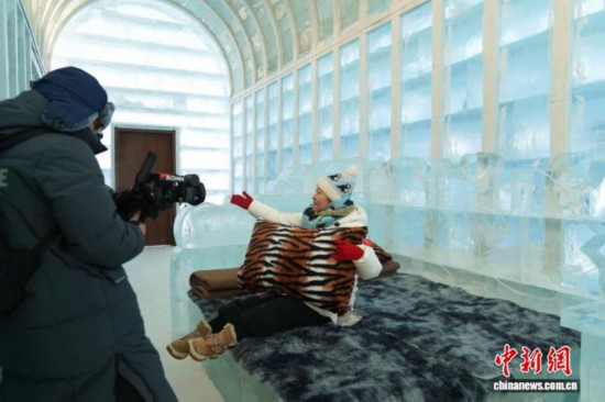 冰堡體驗(yàn)休息室布置了冰床、冰沙發(fā)等冰制陳設(shè),讓游客沉浸式體驗(yàn)冰雪住宿的新奇樂趣。 趙宇航 攝 在用雪打造的屋子里,羊肉片、凍豆腐、青菜拼盤等食材已經(jīng)擺好,陸續(xù)有游客前來體驗(yàn)雪屋火鍋的“冷熱交替”。“外面零下二三十度,吃著沸騰的火鍋很刺激?!北本┯慰蛣⒉┛≌f。