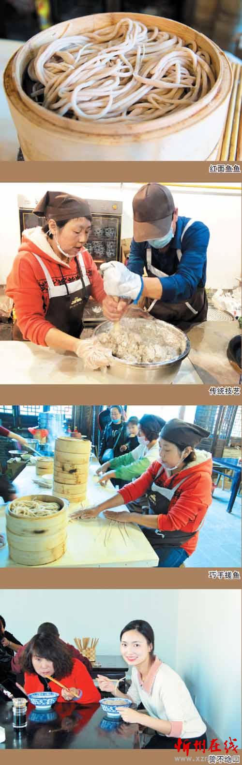 這家店的女主人叫康秀蘭,今年51歲,忻府區(qū)豆羅鎮(zhèn)韓溝村人。秀蘭從小勤快,幫助母親洗鍋做飯,學(xué)搓魚魚。18歲時便遠(yuǎn)近聞名,掌握了搓魚魚的好手藝。在今年忻州古城招商比賽入圍的6家店鋪中,秀蘭的小店脫穎而出,奪得第一名,拿到了開門店的資格。眼下夫妻二人經(jīng)營著兩間大的門臉兒,小籠屜蒸魚魚,臊子有鮮肉蘑菇、西紅柿和老酸菜湯,食客們可根據(jù)自己的喜好選擇。他們兩口子既當(dāng)老板又是廚師。在食客多時臨時雇幾個幫工,小生意做得風(fēng)生水起??敌闾m告訴筆者,自開張以來食客不斷增加,國慶節(jié)假期期間一天的最高銷售紀(jì)錄是賣出200多籠紅面魚魚。