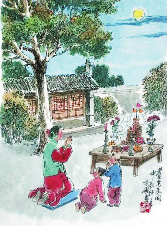“中秋月。月到中秋偏皎潔?!辟p月是中秋節(jié)的重要習俗,我國民間的中秋賞月活動約始于魏晉時期,盛于唐朝,當時許多名篇佳作中都有詠月的詩句。北宋時期,以賞月活動為中心的中秋節(jié)已成為普遍的民俗節(jié)日,然而與唐代不同的是,宋代關(guān)于賞月的作品多是感物傷懷,以陰晴圓缺喻人情世態(tài)。宋代的中秋夜是不眠之夜,夜市通宵營業(yè),游人絡繹不絕,《東京夢華錄》中載:“中秋節(jié)前,諸店皆賣新酒,貴家結(jié)飾臺榭,民家爭占酒樓玩月,笙歌遠聞千里,嬉戲連坐至曉?!币恍┑胤缴踔亮鱾鳌爸星镆乖酵硭介L壽”的說法,于是有了守夜的習俗。守夜時,家里長輩通常會給小孩講關(guān)于月亮的故事,如嫦娥奔月、吳剛伐桂等,孩子們個個聽得津津有味。