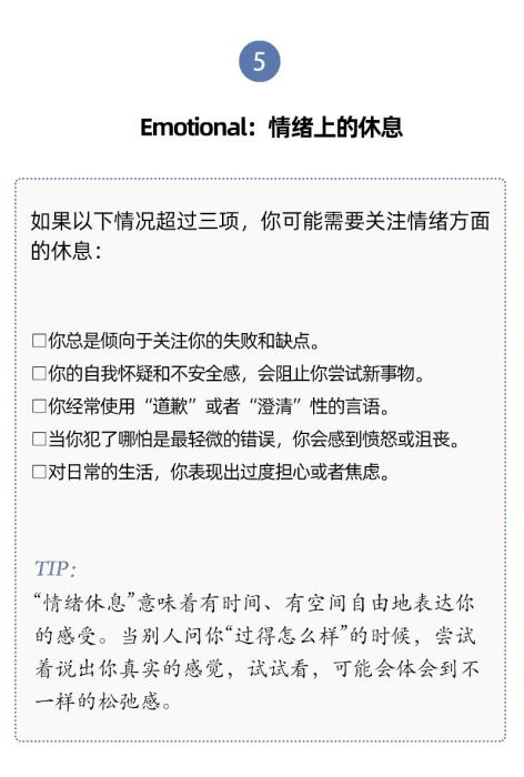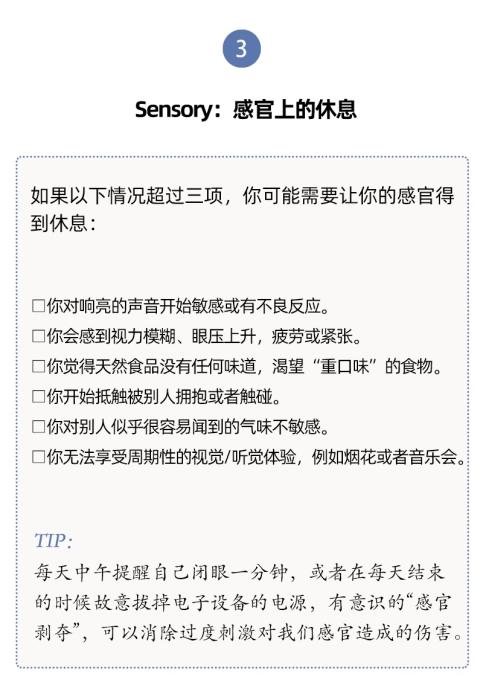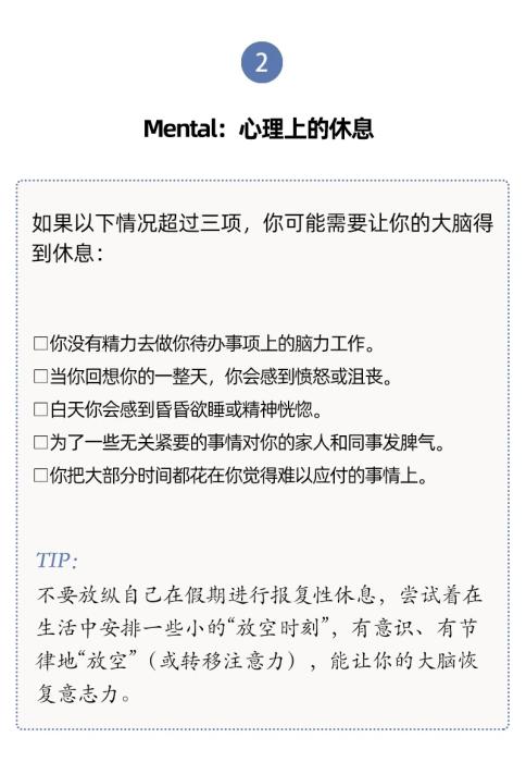 人們對(duì)于休息有不同層面的需要,休息與每一天的生活息息相關(guān)。單靠某一個(gè)具體的假期、某一種具體的活動(dòng)(社交或者睡覺),并不能讓我們恢復(fù)到完全休息好了的狀態(tài)。