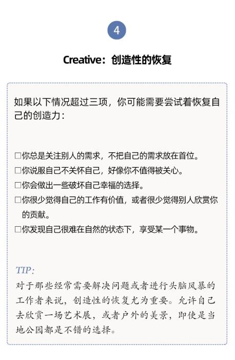 真正的休息,能夠幫助你從受外部刺激影響轉(zhuǎn)向調(diào)整自己的身體、思想和感受。當(dāng)你選擇了適合自己的休息方式,集中注意力,就會(huì)和自己聯(lián)系起來,回到當(dāng)下。