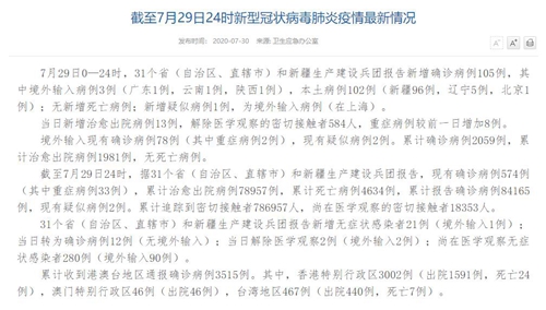 人民網(wǎng)北京7月30日電(董童)國家衛(wèi)生健康委于今日在官網(wǎng)發(fā)布的《截至7月29日24時新型冠狀病毒肺炎疫情最新情況》(以下簡稱“情況”)提出,7月29日0—24時,31個省(自治區(qū)、直轄市)和新疆生產(chǎn)建設(shè)兵團(tuán)報告新增確診病例105例,其中境外輸入病例3例(廣東1例,云南1例,陜西1例),本土病例102例(新疆96例,遼寧5例,北京1例);無新增死亡病例;新增疑似病例1例,為境外輸入病例(在上海)。當(dāng)日新增治愈出院病例13例,解除醫(yī)學(xué)觀察的密切接觸者584人,重癥病例較前一日增加8例。