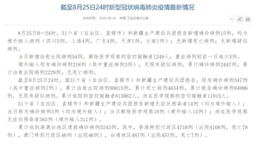 情況顯示,截至8月25日24時,據(jù)31個?。ㄗ灾螀^(qū)、直轄市)和新疆生產(chǎn)建設(shè)兵團(tuán)報告,現(xiàn)有確診病例347例(其中重癥病例7例),累計(jì)治愈出院病例80015例,累計(jì)死亡病例4634例,累計(jì)報告確診病例84996例,無現(xiàn)有疑似病例。累計(jì)追蹤到密切接觸者813062人,尚在醫(yī)學(xué)觀察的密切接觸者11915人。