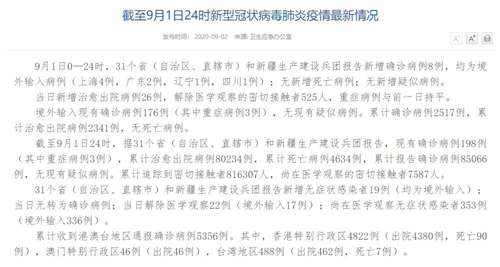 截至9月1日24時(shí),據(jù)31個(gè)?。ㄗ灾螀^(qū)、直轄市)和新疆生產(chǎn)建設(shè)兵團(tuán)報(bào)告,現(xiàn)有確診病例198例(其中重癥病例3例),累計(jì)治愈出院病例80234例,累計(jì)死亡病例4634例,累計(jì)報(bào)告確診病例85066例,無現(xiàn)有疑似病例。累計(jì)追蹤到密切接觸者816307人,尚在醫(yī)學(xué)觀察的密切接觸者7587人。