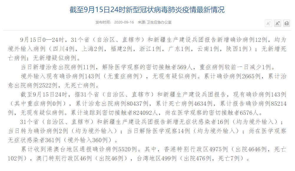 | 國家衛(wèi)健委:9月15日新增確診病例12例 均為境外輸入病例 |