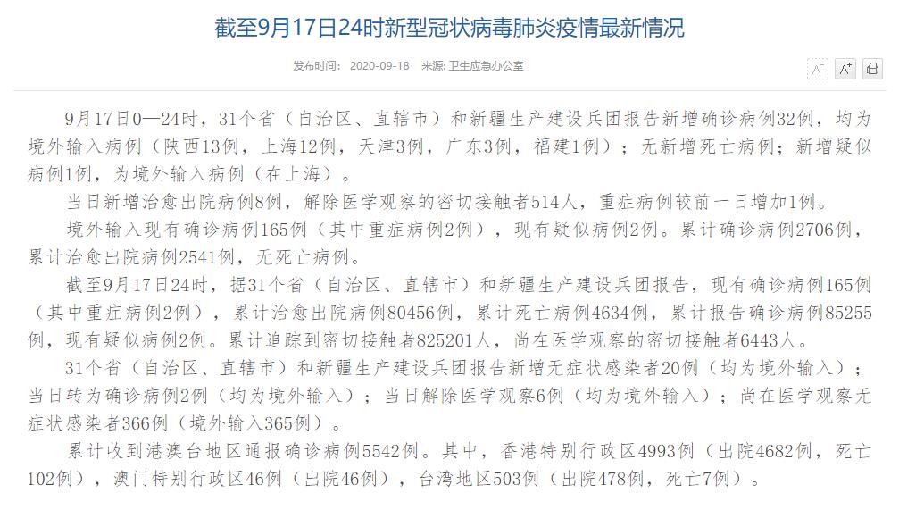 情況顯示,截至9月17日24時(shí),據(jù)31個(gè)?。ㄗ灾螀^(qū)、直轄市)和新疆生產(chǎn)建設(shè)兵團(tuán)報(bào)告,現(xiàn)有確診病例165例(其中重癥病例2例),累計(jì)治愈出院病例80456例,累計(jì)死亡病例4634例,累計(jì)報(bào)告確診病例85255例,現(xiàn)有疑似病例2例。累計(jì)追蹤到密切接觸者825201人,尚在醫(yī)學(xué)觀察的密切接觸者6443人。