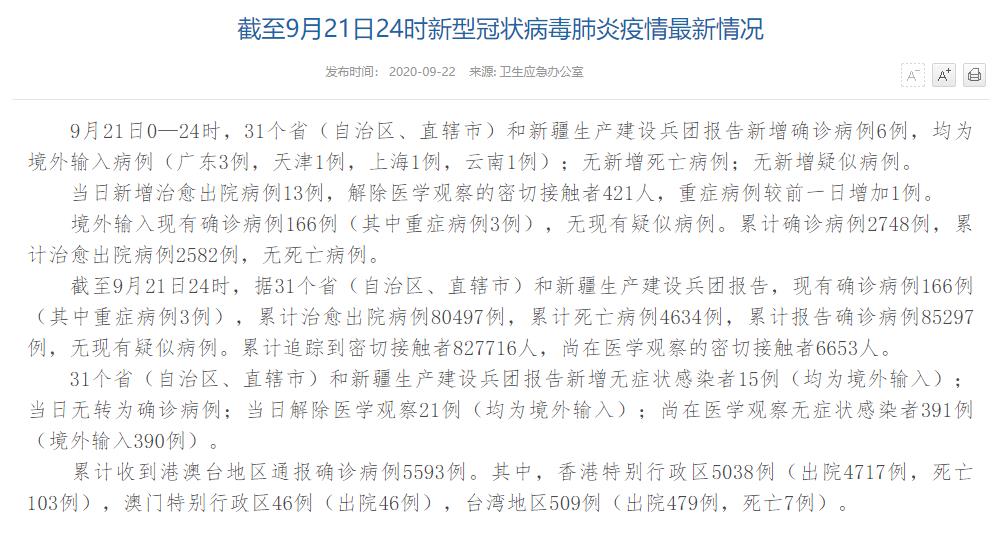 情況顯示,截至9月21日24時,據(jù)31個省(自治區(qū)、直轄市)和新疆生產(chǎn)建設兵團報告,現(xiàn)有確診病例166例(其中重癥病例3例),累計治愈出院病例80497例,累計死亡病例4634例,累計報告確診病例85297例,無現(xiàn)有疑似病例。累計追蹤到密切接觸者827716人,尚在醫(yī)學觀察的密切接觸者6653人。