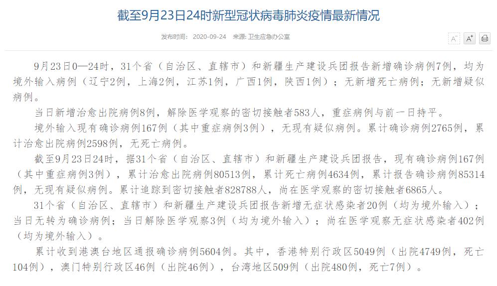 截至9月23日24時,據(jù)31個?。ㄗ灾螀^(qū)、直轄市)和新疆生產(chǎn)建設(shè)兵團報告,現(xiàn)有確診病例167例(其中重癥病例3例),累計治愈出院病例80513例,累計死亡病例4634例,累計報告確診病例85314例,無現(xiàn)有疑似病例。累計追蹤到密切接觸者828788人,尚在醫(yī)學(xué)觀察的密切接觸者6865人。
