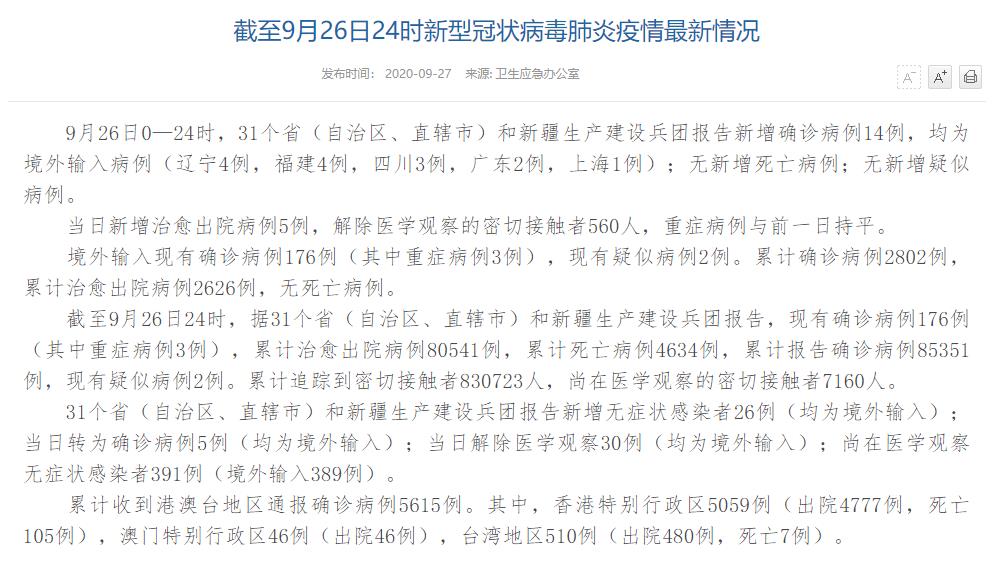 人民網(wǎng)北京9月27日電(董童)國家衛(wèi)生健康委于今日在官網(wǎng)發(fā)布的《截至9月26日24時(shí)新型冠狀病毒肺炎疫情最新情況》(以下簡稱“情況”)提出,9月26日0—24時(shí),31個(gè)省(自治區(qū)、直轄市)和新疆生產(chǎn)建設(shè)兵團(tuán)報(bào)告新增確診病例14例,均為境外輸入病例(遼寧4例,福建4例,四川3例,廣東2例,上海1例);無新增死亡病例;無新增疑似病例。當(dāng)日新增治愈出院病例5例,解除醫(yī)學(xué)觀察的密切接觸者560人,重癥病例與前一日持平。