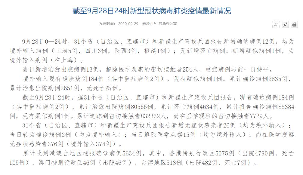 人民網(wǎng)北京9月29日電(董童)國家衛(wèi)生健康委于今日在官網(wǎng)發(fā)布的《截至9月28日24時新型冠狀病毒肺炎疫情最新情況》(以下簡稱“情況”)提出,9月28日0—24時,31個?。ㄗ灾螀^(qū)、直轄市)和新疆生產(chǎn)建設(shè)兵團(tuán)報告新增確診病例12例,均為境外輸入病例(上海5例,四川3例,陜西3例,福建1例);無新增死亡病例;新增疑似病例1例,為境外輸入病例(在上海)。當(dāng)日新增治愈出院病例13例,解除醫(yī)學(xué)觀察的密切接觸者254人,重癥病例與前一日持平。