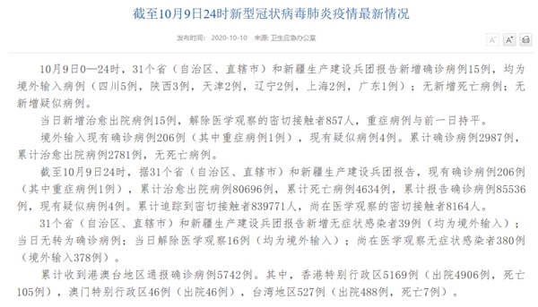 | 國家衛(wèi)健委:10月9日新增確診病例15例 均為境外輸入病例 |