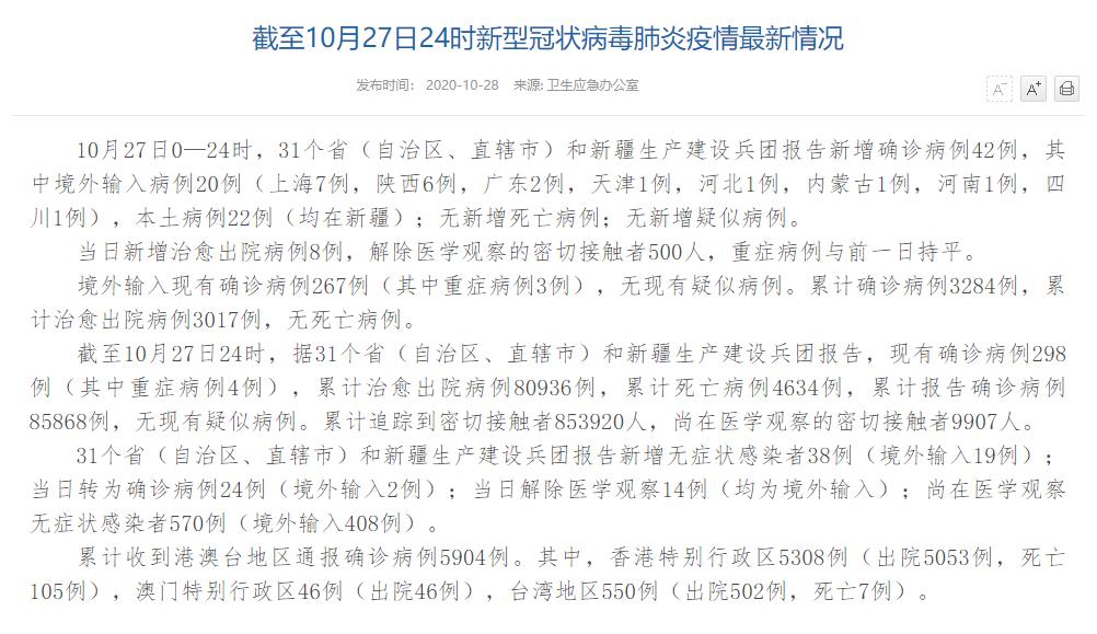 人民網北京10月28日電(董童)國家衛(wèi)生健康委于今日在官網發(fā)布的《截至10月27日24時新型冠狀病毒肺炎疫情最新情況》(以下簡稱“情況”)提出,10月27日0—24時,31個?。ㄗ灾螀^(qū)、直轄市)和新疆生產建設兵團報告新增確診病例42例,其中境外輸入病例20例(上海7例,陜西6例,廣東2例,天津1例,河北1例,內蒙古1例,河南1例,四川1例),本土病例22例(均在新疆);無新增死亡病例;無新增疑似病例。當日新增治愈出院病例8例,解除醫(yī)學觀察的密切接觸者500人,重癥病例與前一日持平。