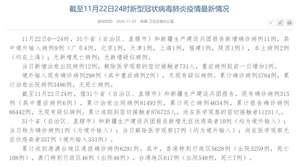 人民網(wǎng)北京11月23日電(董童)國(guó)家衛(wèi)生健康委于今日在官網(wǎng)發(fā)布的《截至11月22日24時(shí)新型冠狀病毒肺炎疫情最新情況》(以下簡(jiǎn)稱(chēng)“情況”)指出,11月22日0—24時(shí),31個(gè)省(自治區(qū)、直轄市)和新疆生產(chǎn)建設(shè)兵團(tuán)報(bào)告新增確診病例11例,其中境外輸入病例9例(廣東4例,北京1例,天津1例,上海1例,福建1例,陜西1例),本土病例2例(均在上海);無(wú)新增死亡病例;無(wú)新增疑似病例。當(dāng)日新增治愈出院病例12例,解除醫(yī)學(xué)觀察的密切接觸者731人,重癥病例較前一日增加1例。