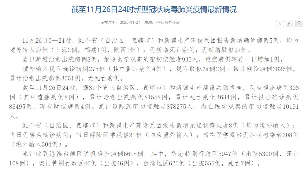 人民網北京11月27日電(董童)國家衛(wèi)生健康委于今日在官網發(fā)布的《截至11月26日24時新型冠狀病毒肺炎疫情最新情況》(以下簡稱“情況”)指出,11月26日0—24時,31個?。ㄗ灾螀^(qū)、直轄市)和新疆生產建設兵團報告新增確診病例5例,均為境外輸入病例(上海3例,福建1例,陜西1例);無新增死亡病例;無新增疑似病例。當日新增治愈出院病例8例,解除醫(yī)學觀察的密切接觸者930人,重癥病例較前一日增加1例。