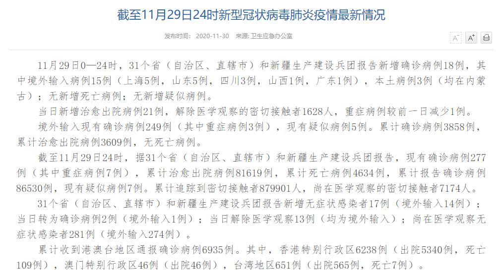 人民網(wǎng)北京11月30日電(董童)國(guó)家衛(wèi)生健康委于今日在官網(wǎng)發(fā)布的《截至11月29日24時(shí)新型冠狀病毒肺炎疫情最新情況》(以下簡(jiǎn)稱“情況”)指出,11月29日0—24時(shí),31個(gè)?。ㄗ灾螀^(qū)、直轄市)和新疆生產(chǎn)建設(shè)兵團(tuán)報(bào)告新增確診病例18例,其中境外輸入病例15例(上海5例,山東5例,四川3例,山西1例,廣東1例),本土病例3例(均在內(nèi)蒙古);無(wú)新增死亡病例;無(wú)新增疑似病例。當(dāng)日新增治愈出院病例21例,解除醫(yī)學(xué)觀察的密切接觸者1628人,重癥病例較前一日減少1例。