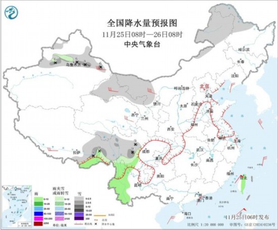 全國(guó)降水量預(yù)報(bào)圖(11月25日08時(shí)-26日08時(shí))