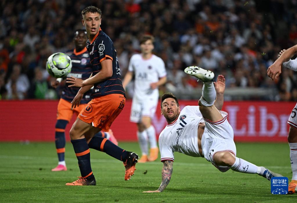 5月14日,巴黎圣日耳曼隊球員梅西(右)在2021-2022賽季法國足球甲級聯(lián)賽第37輪比賽中。新華社/法新