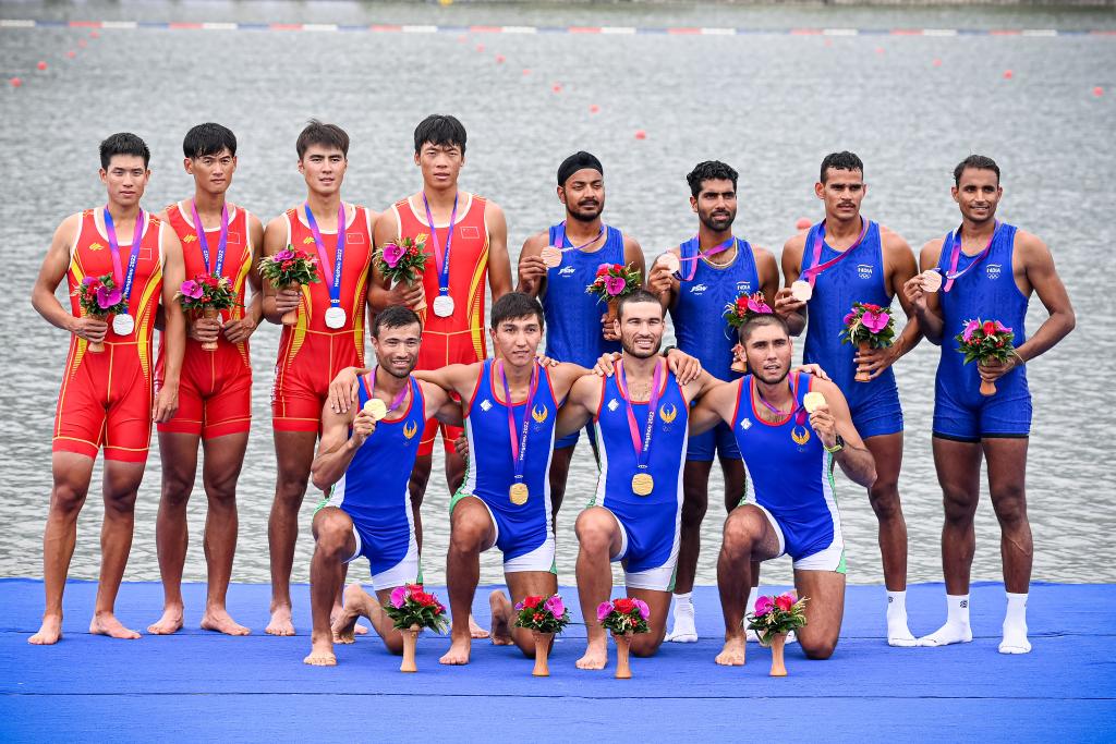 9月25日,男子四人單槳無舵手頒獎(jiǎng)儀式上,冠軍烏茲別克斯坦隊(duì)(前)、亞軍中國隊(duì)(后左)、季軍印度隊(duì)合影。新華社記者 江漢 攝