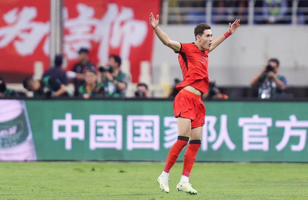 6月6日,首次代表國(guó)家隊(duì)出場(chǎng)的中國(guó)隊(duì)球員拜合拉木在進(jìn)球后慶祝。新華社記者 賈浩成 攝