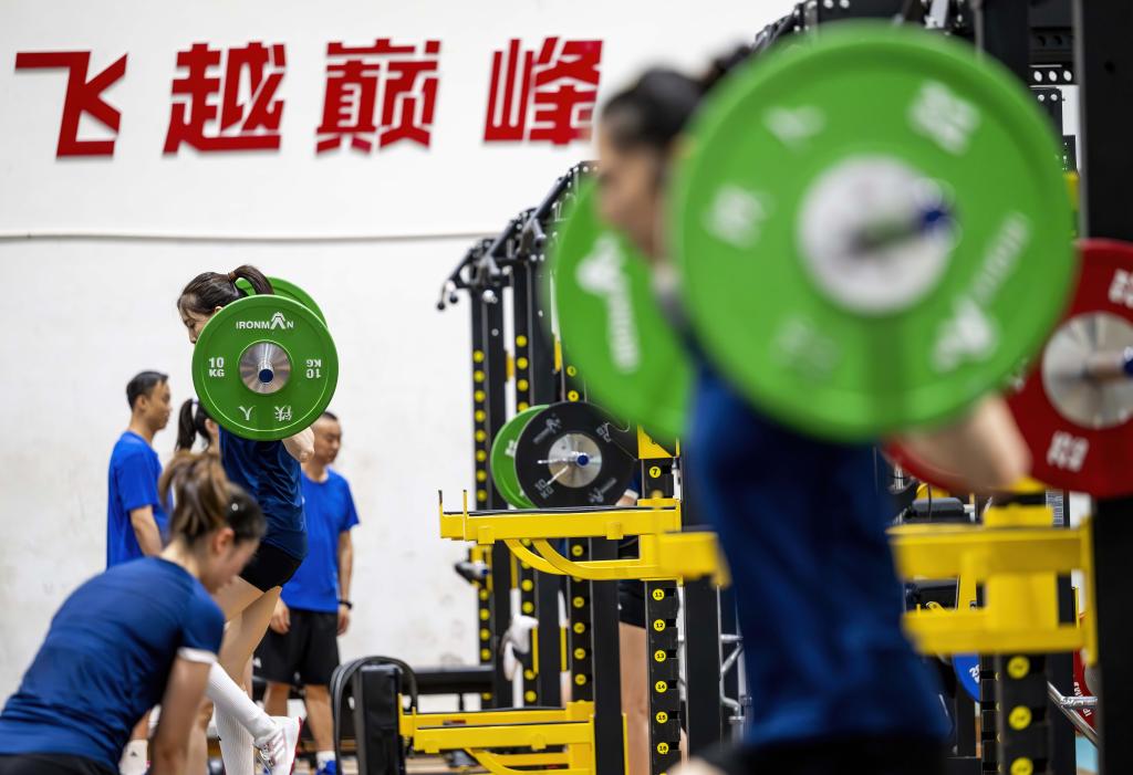7月13日,中國女排隊員在進行力量訓練。新華社記者 魏培全 攝