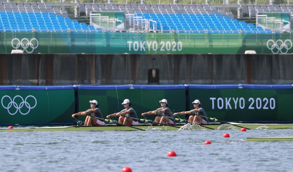 2021年7月20日,中國賽艇隊女子四人雙槳隊員在訓(xùn)練中。當(dāng)日,中國賽艇隊在日本東京海之森水上競技場訓(xùn)練,備戰(zhàn)即將開幕的東京奧運會。新華社記者 杜瀟逸 攝