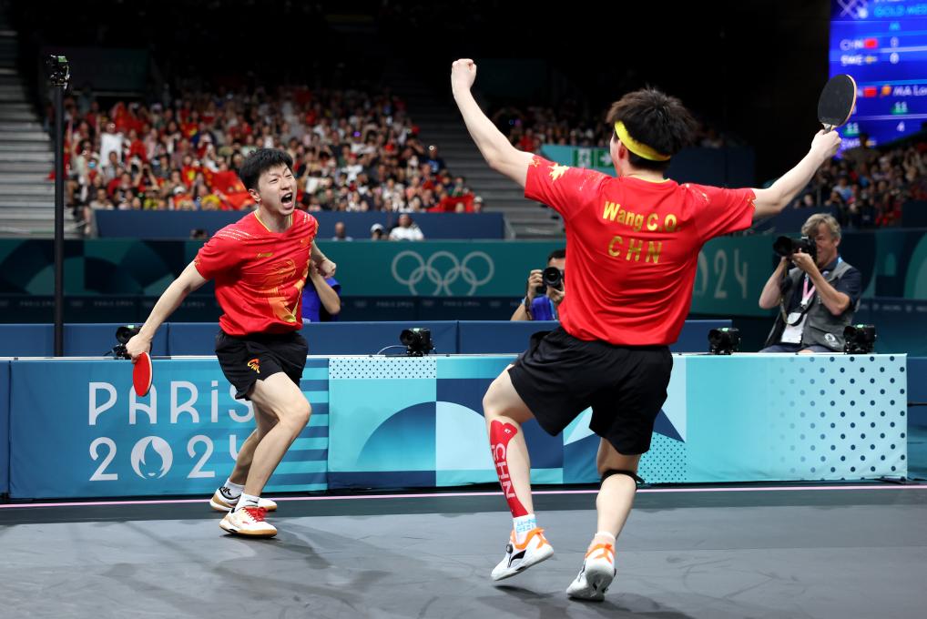 2024年8月9日,中國隊組合馬龍(左)/王楚欽慶祝勝利。當(dāng)日,在巴黎奧運會乒乓球男團金牌賽中,中國隊?wèi)?zhàn)勝瑞典隊,獲得冠軍。新華社記者 劉續(xù) 攝