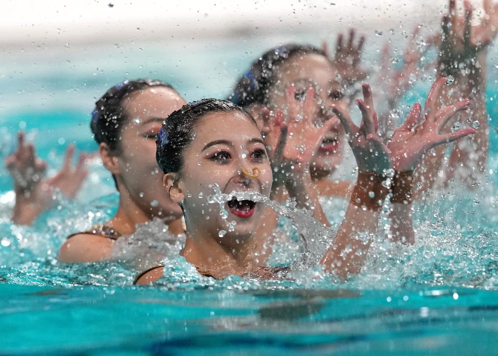 冠軍中國隊在集體技巧自選決賽頒獎儀式上。15日,在2025年花樣游泳世界杯總決賽集體技巧自選決賽中,中國隊獲得冠軍。新華社記者 李一博 攝