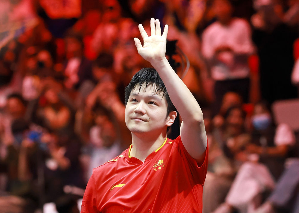 11月16日,上海隊(duì)選手樊振東賽后向觀眾揮手致意。新華社記者 梁旭 攝
