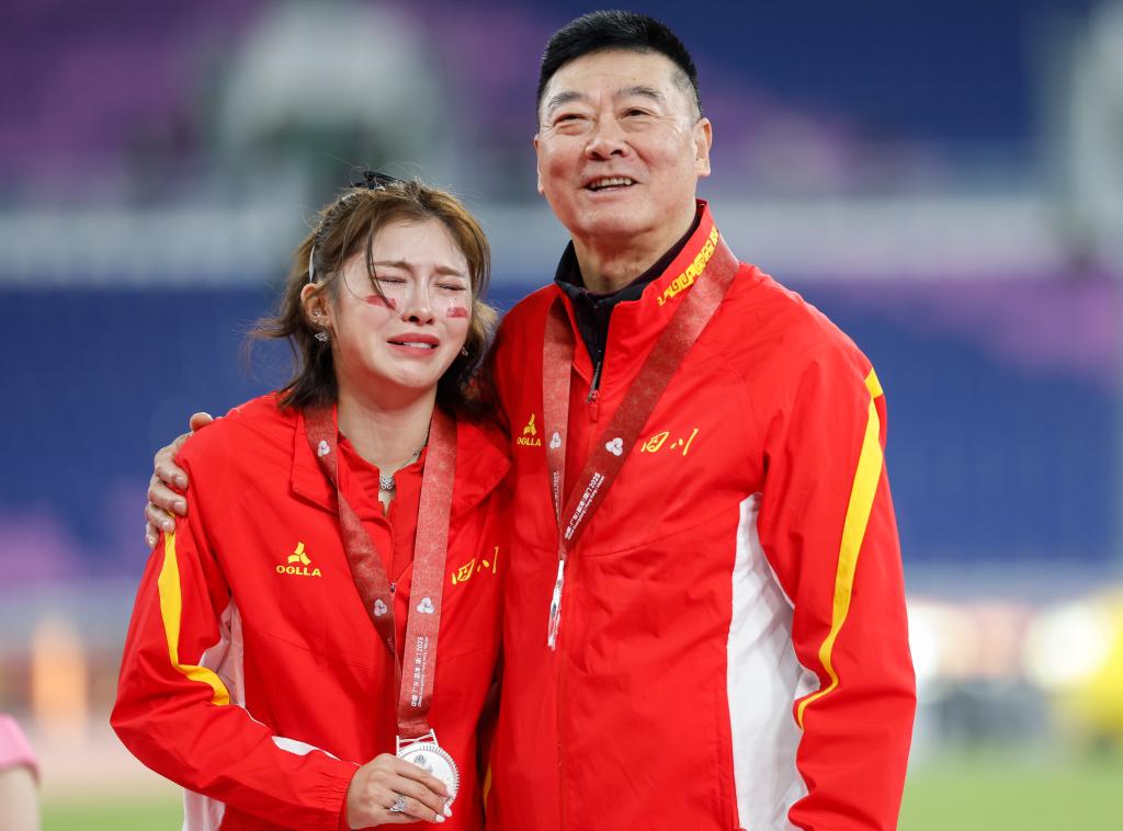 11月19日,獲得亞軍的四川隊(duì)選手吳艷妮(左)在頒獎(jiǎng)儀式上哭泣。新華社記者 黃偉 攝