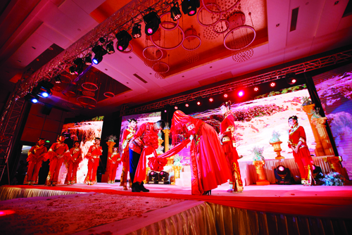 “秉父母之命,承媒妁之言,今日,新人喜結(jié)連理,諸賓共睹,天地同鑒,于此,新人三拜。一拜,感天地之造化,緣分天賜,德行地載。愿天地賜福,婚姻美滿(mǎn),天長(zhǎng)地久。再拜,婚姻之意義,為延續(xù)生命,推進(jìn)文明。上以繼父母之血統(tǒng),下以開(kāi)萬(wàn)代之文化。三拜,今夕何夕,得此良人。愿此生忠貞不二,矢志不渝?!痹谔咸宵S河和大紅燈籠的映襯之下,一對(duì)身著中式婚禮服的新人隆重登場(chǎng)。鳳冠霞帔、紅花禮帽,古樸而莊重,喜氣又脫俗。民歌《想親親》道出了一對(duì)新人浪漫甜蜜的愛(ài)情故事,悠揚(yáng)嘹亮的嗩吶聲吹響了幸福的號(hào)角,一對(duì)甜蜜的新人在親朋好友的簇?fù)碇逻~入洞房。中式婚禮秀《想親親》讓現(xiàn)場(chǎng)的每一位觀眾感同身受,秀容大地的獨(dú)特風(fēng)俗文化在一場(chǎng)婚禮秀中體現(xiàn)得淋漓盡致。