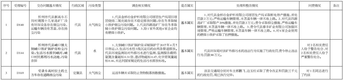 我市高度重視,立即組織查處,截至5月4日,督辦的3件群眾反映問(wèn)題已辦結(jié)。其中,代縣確認(rèn)基本屬實(shí)的2件;定襄縣確認(rèn)屬實(shí)的1件。對(duì)于屬實(shí)已辦結(jié)的環(huán)保問(wèn)題,分別采取了相應(yīng)處理措施,其中限產(chǎn)停產(chǎn)1件2家、查封扣押1件5家、罰款92.6萬(wàn)元;目前,代縣對(duì)2名相關(guān)責(zé)任人給予警告處分、2名相關(guān)責(zé)任人給予嚴(yán)重警告處分;定襄縣對(duì)1名相關(guān)責(zé)任人進(jìn)行了約談;對(duì)3件群眾反應(yīng)問(wèn)題調(diào)查處理情況進(jìn)行了信息公開(kāi)。