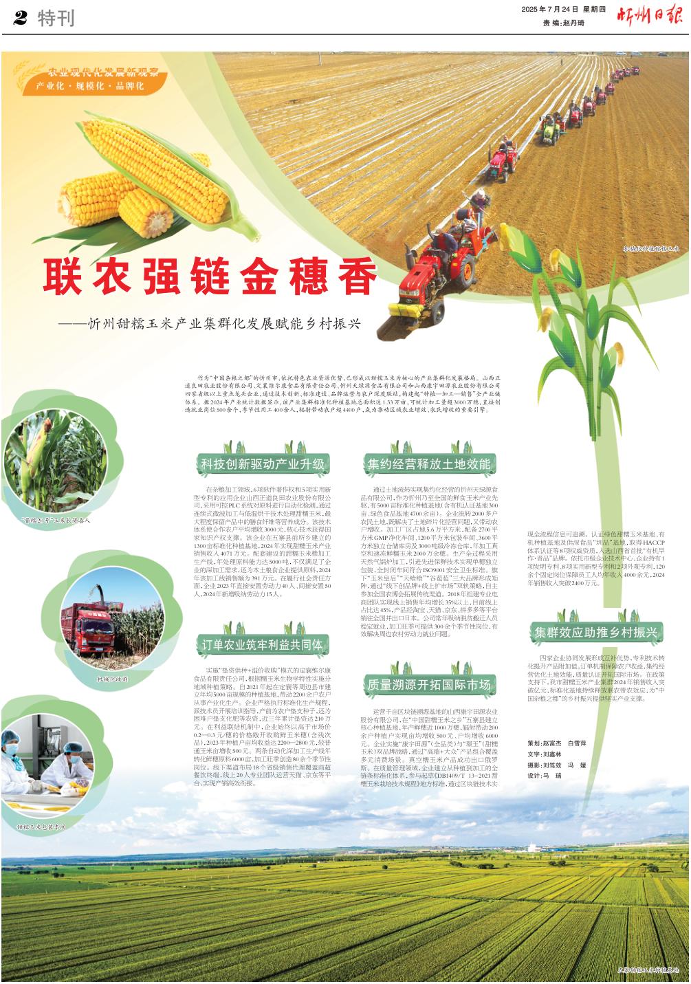 作為“中國雜糧之都”的忻州市,依托特色農(nóng)業(yè)資源優(yōu)勢,已形成以甜糯玉米為核心的產(chǎn)業(yè)集群化發(fā)展格局。山西正道良田農(nóng)業(yè)股份有限公司、定襄維爾康食品有限責(zé)任公司、忻州天綠源食品有限公司和山西康宇田源農(nóng)業(yè)股份有限公司四家省級以上重點龍頭企業(yè),通過技術(shù)創(chuàng)新、標(biāo)準(zhǔn)建設(shè)、品牌運營與農(nóng)戶深度聯(lián)結(jié),構(gòu)建起“種植—加工—銷售”全產(chǎn)業(yè)鏈體系。據(jù)2024年產(chǎn)業(yè)統(tǒng)計數(shù)據(jù)顯示,該產(chǎn)業(yè)集群標(biāo)準(zhǔn)化種植基地總面積達(dá)1.33萬畝,可統(tǒng)計加工量超3000萬穗,直接創(chuàng)造就業(yè)崗位500余個,季節(jié)性用工400余人,輻射帶動農(nóng)戶超4400戶,成為推動區(qū)域農(nóng)業(yè)增效、農(nóng)民增收的重要引擎。