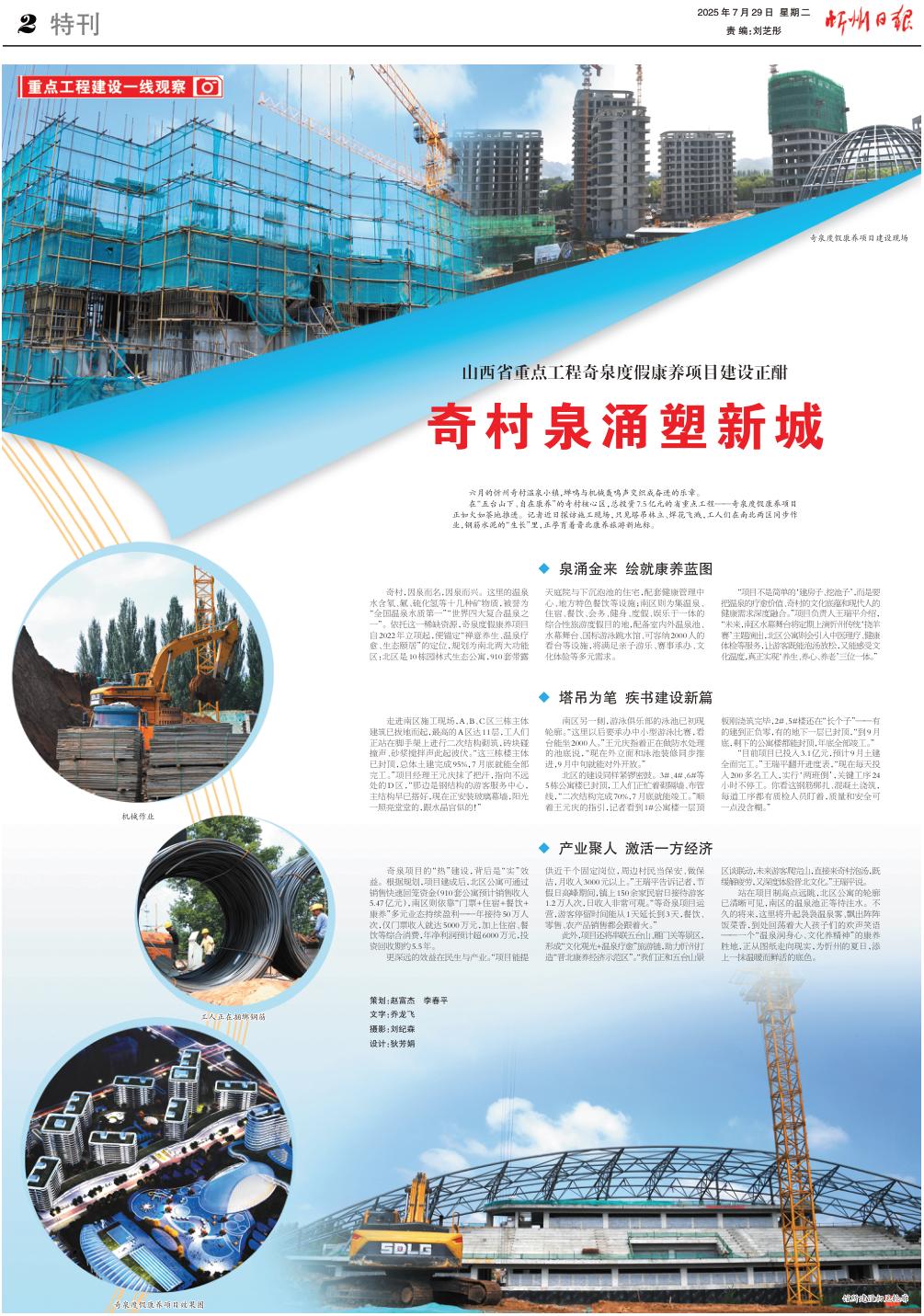 在“五臺山下、自在康養(yǎng)”的奇村核心區(qū),總投資7.5億元的省重點(diǎn)工程——奇泉度假康養(yǎng)項目正如火如荼地推進(jìn)。記者近日探訪施工現(xiàn)場,只見塔吊林立、焊花飛濺,工人們在南北兩區(qū)同步作業(yè),鋼筋水泥的“生長”里,正孕育著晉北康養(yǎng)旅游新地標(biāo)。