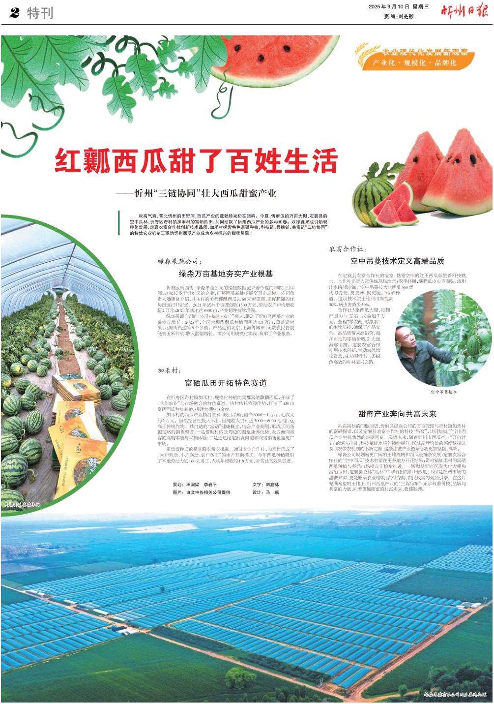 秋高氣爽,晉北忻州的田野間,西瓜產業(yè)的蓬勃脈動仍在回響。今夏,忻府區(qū)的萬畝大棚、定襄縣的空中瓜林、忻府區(qū)奇村鎮(zhèn)加禾村的富硒瓜田,共同繪就了忻州西瓜產業(yè)的多彩畫卷。以綠淼果蔬引領規(guī)模化發(fā)展、定襄農富合作社創(chuàng)新技術品質、加禾村探索特色富硒種植,科技鏈、品牌鏈、共富鏈“三鏈協(xié)同”的特優(yōu)農業(yè)機制正驅動忻州西瓜產業(yè)成為鄉(xiāng)村振興的甜蜜引擎。