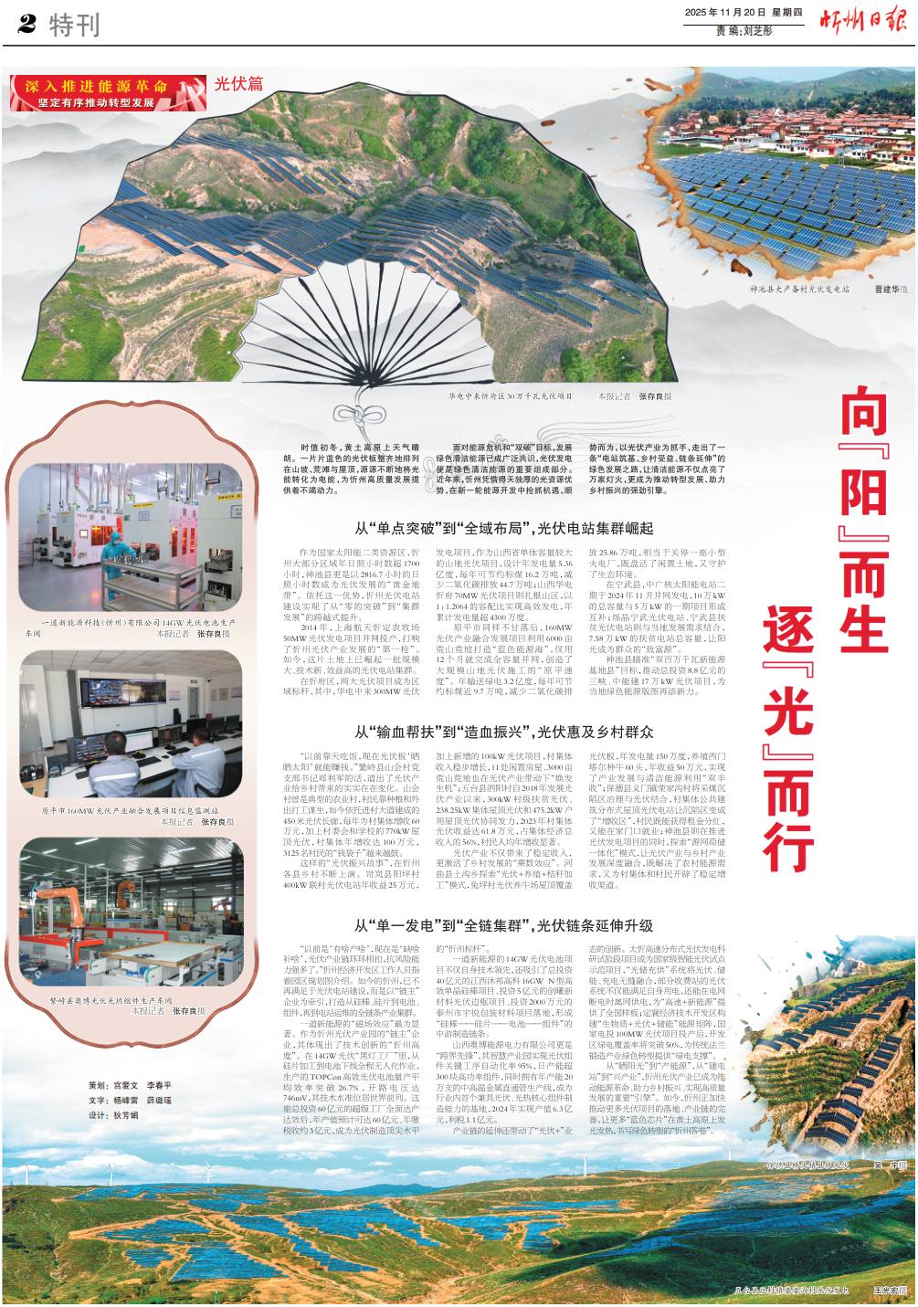 從“曬陽光”到“產(chǎn)能源”,從“建電站”到“興產(chǎn)業(yè)”,忻州光伏產(chǎn)業(yè)已成為推動能源革命、助力鄉(xiāng)村振興、實現(xiàn)高質(zhì)量發(fā)展的重要“引擎”。如今,忻州正加快推動更多光伏項目的落地、產(chǎn)業(yè)鏈的完善,讓更多“藍色芯片”在黃土高原上發(fā)光發(fā)熱,書寫綠色轉(zhuǎn)型的“忻州答卷”。