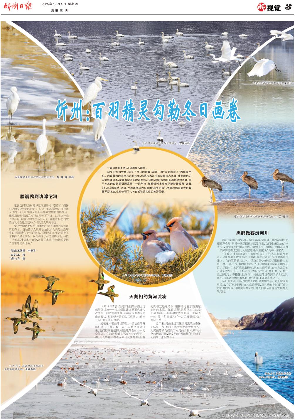 初冬的忻州大地,褪去了秋日的斑斕,卻因一群“靈動的客人”而煥發(fā)生機(jī)。河曲黃河的流凌與天鵝共舞,保德朱家川河的白鷺輕點水面,神池濕地的天鵝梳理羽毛,定襄滹沱河的臉譜鴨掠過沼澤,靜樂汾河川的黑鸛休憩覓食,原平水庫的白天鵝引頸高歌……近年來,隨著忻州市生態(tài)環(huán)境持續(xù)改善,各縣(市、區(qū))的濕地、河流、水庫逐漸成為鳥類的“越冬樂園”,各類珍稀鳥類種群數(shù)量不斷增加,生動詮釋了人與自然和諧共生的美好圖景。