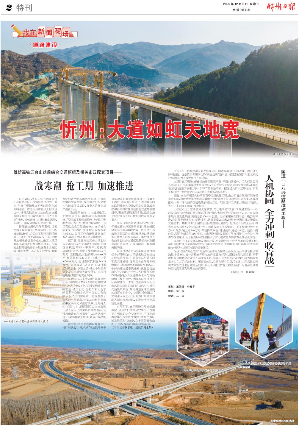 雄忻高鐵五臺(tái)山站前綜合交通樞紐及相關(guān)市政配套項(xiàng)目—— 戰(zhàn)寒潮 搶工期 加速推進(jìn) 11月28日,冬日的陽光灑在五臺(tái)山風(fēng)景名勝區(qū)石咀鎮(zhèn)新路口村的土地上,與施工現(xiàn)場熱火朝天的景象形成鮮明呼應(yīng)。作為忻州市重點(diǎn)工程項(xiàng)目之一,雄忻高鐵五臺(tái)山站前綜合交通樞紐及相關(guān)市政配套項(xiàng)目正以“加速度”推進(jìn),機(jī)械轟鳴、人員忙碌的場景,勾勒出一幅設(shè)施建設(shè)的生動(dòng)圖景。 伴隨著挖掘機(jī)的陣陣轟鳴,記者在施工現(xiàn)場看到,黃褐色的土方不斷被挖掘、轉(zhuǎn)運(yùn),為后續(xù)工程建設(shè)掃清障礙;不遠(yuǎn)處,水泥罐車穿梭往來,將混凝土精準(zhǔn)輸送至作業(yè)點(diǎn),施工人員正有條不紊地進(jìn)行基礎(chǔ)墊層澆筑。頭戴安全帽的建設(shè)者們分散在各個(gè)工程區(qū)域,有的手持工具進(jìn)行支護(hù)噴錨,有的彎腰細(xì)致粘貼基礎(chǔ)防水卷材,還有的在鋼筋架間穿梭,專注地進(jìn)行鋼筋綁扎和地庫頂板搭設(shè),每個(gè)人的身上都洋溢著干勁。 “目前每天有約100人進(jìn)場施工,大家輪班作業(yè),確保項(xiàng)目不停歇推進(jìn)。”項(xiàng)目部工程師郝艷剛指著施工進(jìn)度表向記者介紹,截至目前,項(xiàng)目土方工程已完成工程量的95%,支護(hù)樁完成90%,抗污錨桿完成70%,筏板基礎(chǔ)完成30%,各項(xiàng)工作均按照計(jì)劃有序推進(jìn),部分工程進(jìn)度甚至超出預(yù)期。 據(jù)了解,雄忻高鐵五臺(tái)山站前綜合交通樞紐及相關(guān)市政配套項(xiàng)目總建筑面積達(dá)25501.6平方米,總投資49002.95萬元,其中工程費(fèi)用38543.75萬元,工程建設(shè)其他費(fèi)用3649.60萬元,預(yù)備費(fèi)3375.47萬元,土地出讓金3070.89萬元,建設(shè)期貸款利息363.24萬元。資金籌措方式多元,擬通過景區(qū)財(cái)政資金、申請上級補(bǔ)助、爭取債券資金及公司融資等途徑落實(shí),為項(xiàng)目建設(shè)提供堅(jiān)實(shí)的資金保障。 從功能布局來看,項(xiàng)目規(guī)劃建設(shè)社會(huì)、網(wǎng)約車場228個(gè)(其中充電樁35個(gè))、出租車場30個(gè),同時(shí)將構(gòu)建集公路客運(yùn)、城市公交、出租車和社會(huì)車輛等多種交通方式于一體的綜合換乘體系?!拔覀冊谠O(shè)計(jì)上充分考慮了旅客的出行需求,比如站前樞紐集散換乘區(qū)采用無風(fēng)雨零換乘、無障礙人性化設(shè)計(jì),東、西兩側(cè)的公交旅游巴士和長途大巴車車場布置在地面,通過風(fēng)雨連廊與換乘中心、站房就近連接,讓旅客換乘更便捷、舒適?!焙缕G剛說道。 在國家《中長期鐵路網(wǎng)規(guī)劃》中,雄忻高鐵是“八縱八橫”高速鐵路網(wǎng)中京昆通道的重要組成部分,不僅服務(wù)于西北、西南地區(qū)與華北、東北地區(qū)間的路網(wǎng)性旅客交流,還是京津冀城市群和晉中城市群快速旅客交流的重要紐帶,更兼顧沿線城際客流、旅游客流及扶貧開發(fā)功能,對忻州的發(fā)展意義重大。 而五臺(tái)山風(fēng)景名勝區(qū)作為山西、忻州東接京津冀協(xié)同發(fā)展、雄安新區(qū)建設(shè)等國家戰(zhàn)略的“第一橋頭堡”,當(dāng)前景區(qū)落后的交通設(shè)施已難以滿足游客日益增長的服務(wù)需求。雄忻高鐵五臺(tái)山站前綜合交通樞紐及相關(guān)市政配套項(xiàng)目的建設(shè),正是破解這一難題的關(guān)鍵舉措。 該項(xiàng)目建成后,將實(shí)現(xiàn)多重目標(biāo)任務(wù):保障五臺(tái)山風(fēng)景名勝區(qū)高鐵站功能充分發(fā)揮,引導(dǎo)高鐵站與景區(qū)間客流交通通暢;提升五臺(tái)山站對外疏散能力,確保疏散通道滿足交通需求;維持內(nèi)部交通系統(tǒng)通暢,優(yōu)化公交旅游巴士、長途、社會(huì)車、人行慢行系統(tǒng)布局;提高公共交通服務(wù)水平與高鐵樞紐工程可達(dá)性,保障不同交通模式間換乘便捷。未來,這里將成為五臺(tái)山風(fēng)景區(qū)對外的新門戶、新名片,通過交通集聚效應(yīng),帶動(dòng)周邊區(qū)域形成新的商貿(mào)商業(yè)中心,為景區(qū)“全域旅游”發(fā)展注入強(qiáng)勁動(dòng)力,助力忻州更好地融入國家發(fā)展戰(zhàn)略,實(shí)現(xiàn)經(jīng)濟(jì)社會(huì)高質(zhì)量發(fā)展。 夕陽西下,施工現(xiàn)場的燈光逐漸亮起,建設(shè)者們依然堅(jiān)守崗位。這座正在崛起的綜合交通樞紐,不僅承載著便捷出行的民生期待,更肩負(fù)著區(qū)域發(fā)展的時(shí)代使命,在冬日的五臺(tái)山腳下,書寫著高質(zhì)量建設(shè)的新篇章。(本報(bào)記者張志遠(yuǎn) 通訊員肖世勛) 國道一○八線道路改建工程—— 人機(jī)協(xié)同 全力沖“刺收官”戰(zhàn) 作為太忻一體化經(jīng)濟(jì)區(qū)的先導(dǎo)性項(xiàng)目,國道108線忻州段改建工程已進(jìn)入沖刺階段。這條貫穿忻州南北的“黃金走廊”通車后,將顯著縮短忻州至太原的行車時(shí)間,為區(qū)域發(fā)展注入新動(dòng)能。 在項(xiàng)目施工現(xiàn)場,新鋪設(shè)的路面黝黑平整,不斷向前延伸。工人們正各司其職,有的在小心翼翼地安裝隔聲屏,有的手持專業(yè)設(shè)備施劃交通標(biāo)線,還有的在固定防眩板和護(hù)欄,每一個(gè)環(huán)節(jié)都有條不紊。據(jù)現(xiàn)場負(fù)責(zé)人王峰介紹,所有工程