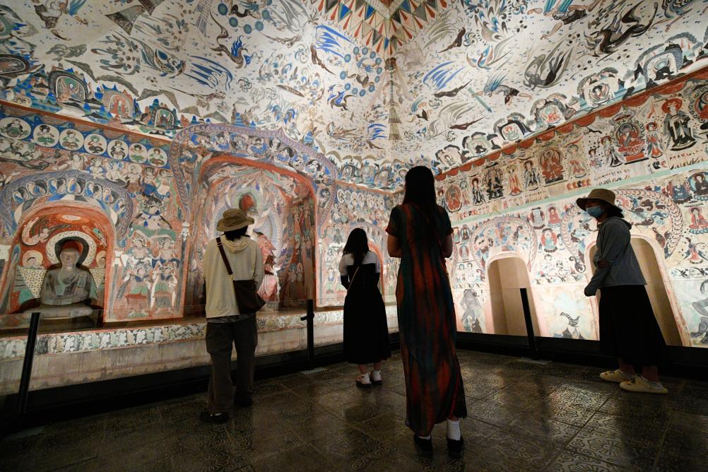 2024年6月7日,在敦煌石窟文物保護研究陳列中心,游客參觀莫高窟復制洞窟第276窟壁畫。新華社記者 郎兵兵 攝