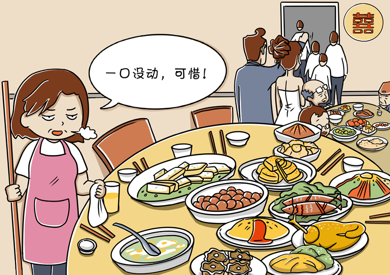杜絕“剩宴”需要社會合力。結(jié)婚“剩宴”并不是短時間形成的,也不是個別現(xiàn)象,因此,根治這種陋習(xí)、在全社會培養(yǎng)節(jié)約意識和節(jié)儉習(xí)慣是一項(xiàng)長期任務(wù),也是一項(xiàng)全民行動,需要社會各界多元化、多角度共同推進(jìn)。比如,黨員干部以身作則,率先垂范;餐飲行業(yè)增強(qiáng)節(jié)約意識,改進(jìn)服務(wù),合理優(yōu)化供應(yīng)標(biāo)準(zhǔn)。只有人人轉(zhuǎn)變觀念,共同做厲行節(jié)約、反對浪費(fèi)的踐行者、宣傳者和監(jiān)督者,才能帶動形成良好社會風(fēng)氣。(文字:馬若虎 漫畫:甘甜)