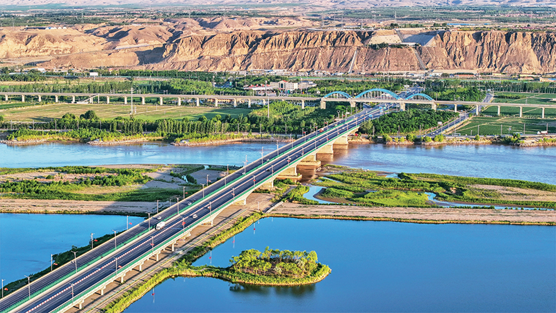 新時(shí)代生態(tài)文明建設(shè)的成就舉世矚目,成為新時(shí)代黨和國家事業(yè)取得歷史性成就、發(fā)生歷史性變革的顯著標(biāo)志。圖為2023年6月13日,位于寧夏中衛(wèi)的黃河公路大橋、黃河鐵路大橋與黃河濕地交相輝映,美麗如畫。人民圖片 柴更利/攝