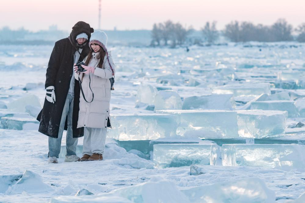 1月7日,在封凍的松花江哈爾濱段,游客在“鉆石?!庇瓮?。新華社記者謝劍飛攝