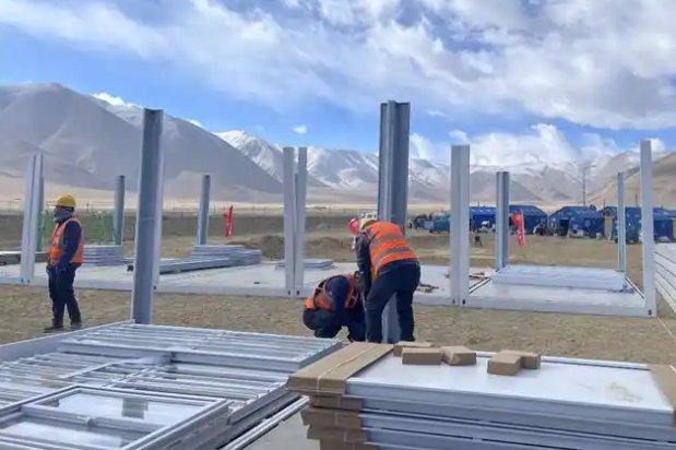 1月13日上午,中鐵二十局工作人員在定日縣措果鄉(xiāng)雪珠村安置點(diǎn)搭建活動(dòng)板房。新華社記者蔣夢(mèng)辰 攝