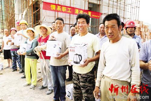 圖為靜樂(lè)縣工會(huì)為該縣殘疾人康復(fù)和托養(yǎng)中心工程施工現(xiàn)場(chǎng)工人發(fā)放熱水壺。